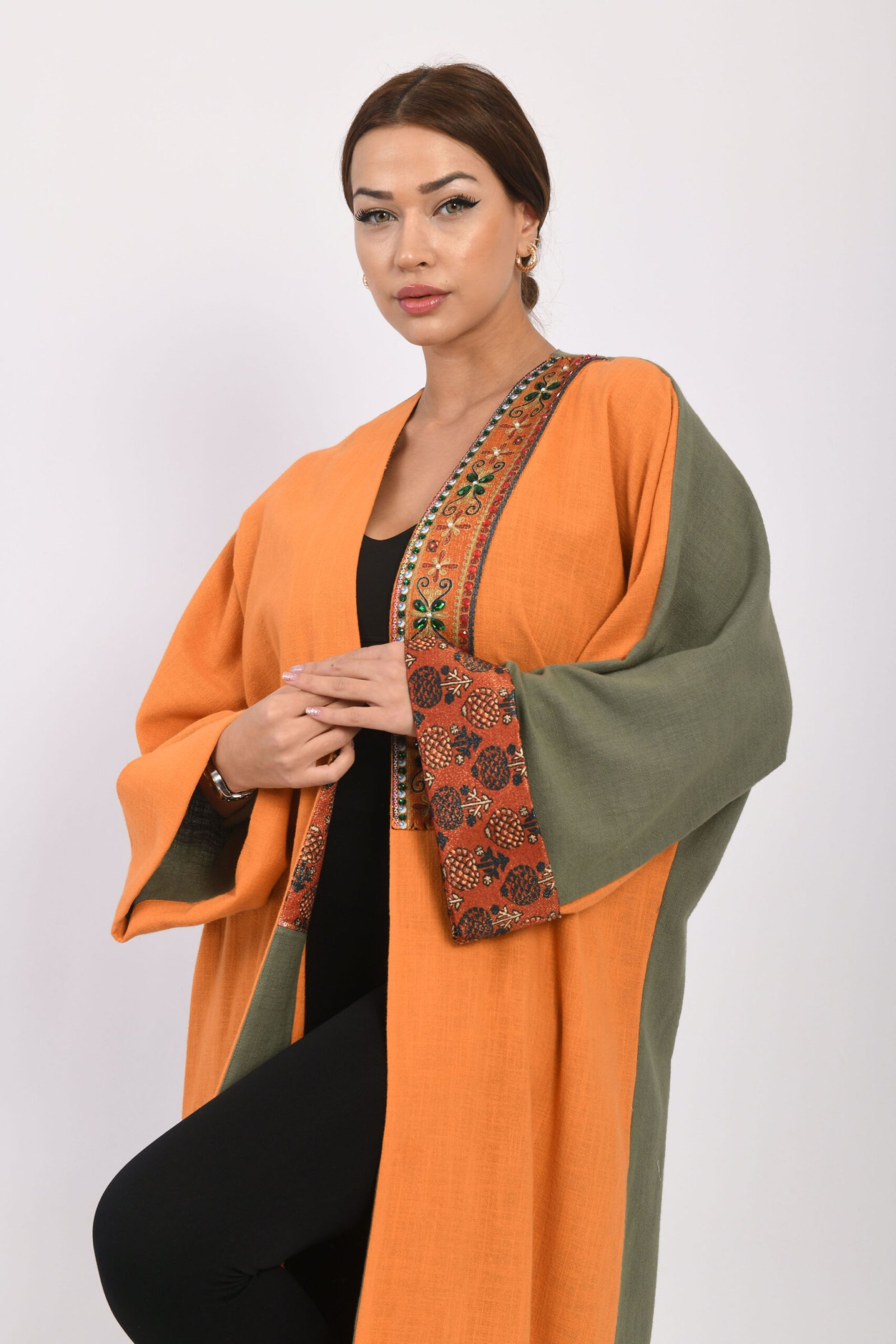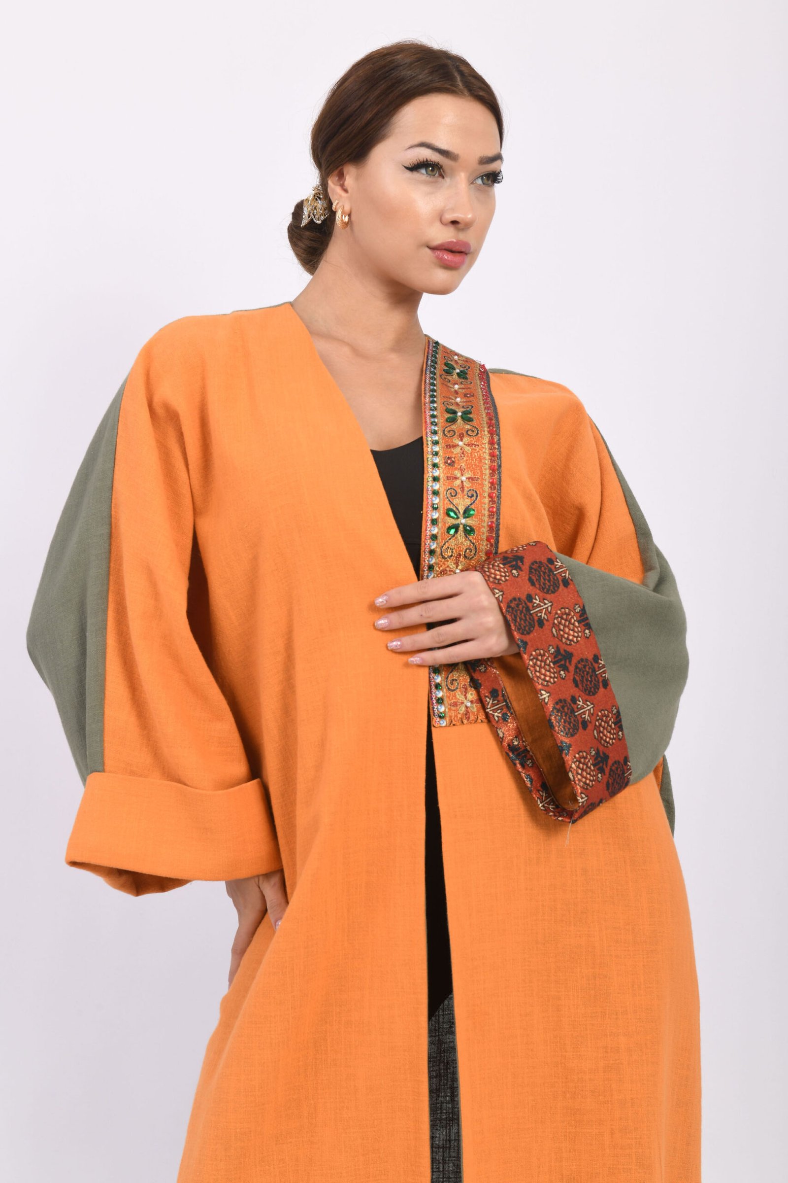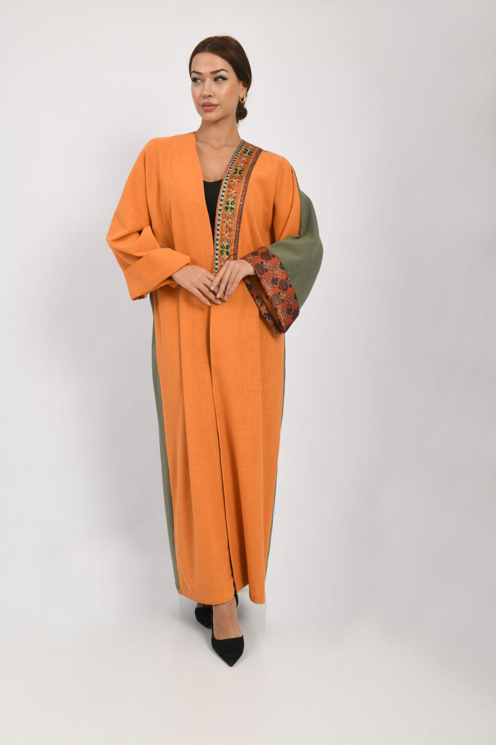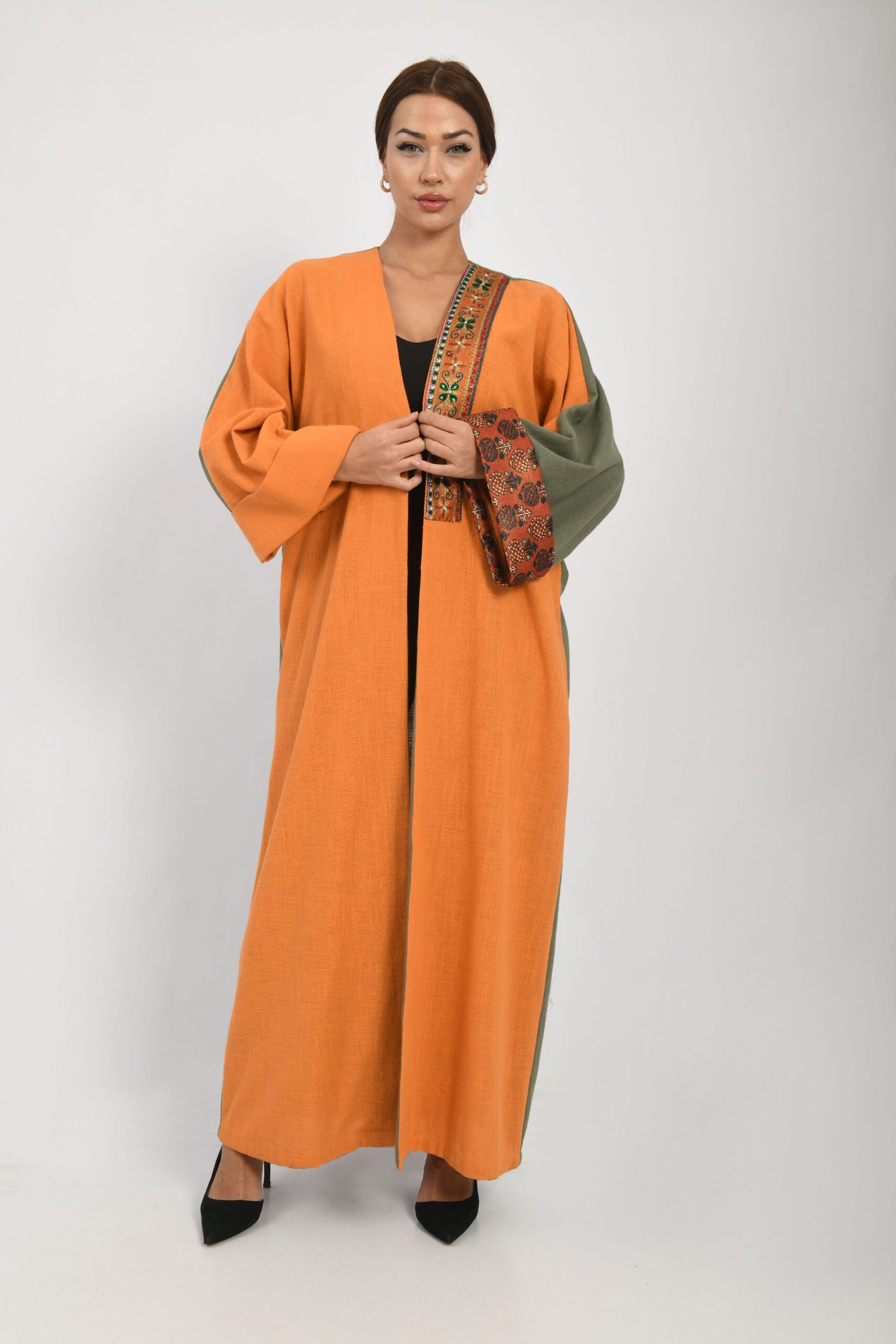 The most captivating feature of this abaya is the bold yet sophisticated statement made by its vivid orange hue. Designed to dazzle in every moment, the abaya boasts a luxurious touch with its shimmering metallic thread fabric accessory, adorned with sparkling stones, extending gracefully from the neckline downwards. This radiant detail accentuates your elegance with every movement.