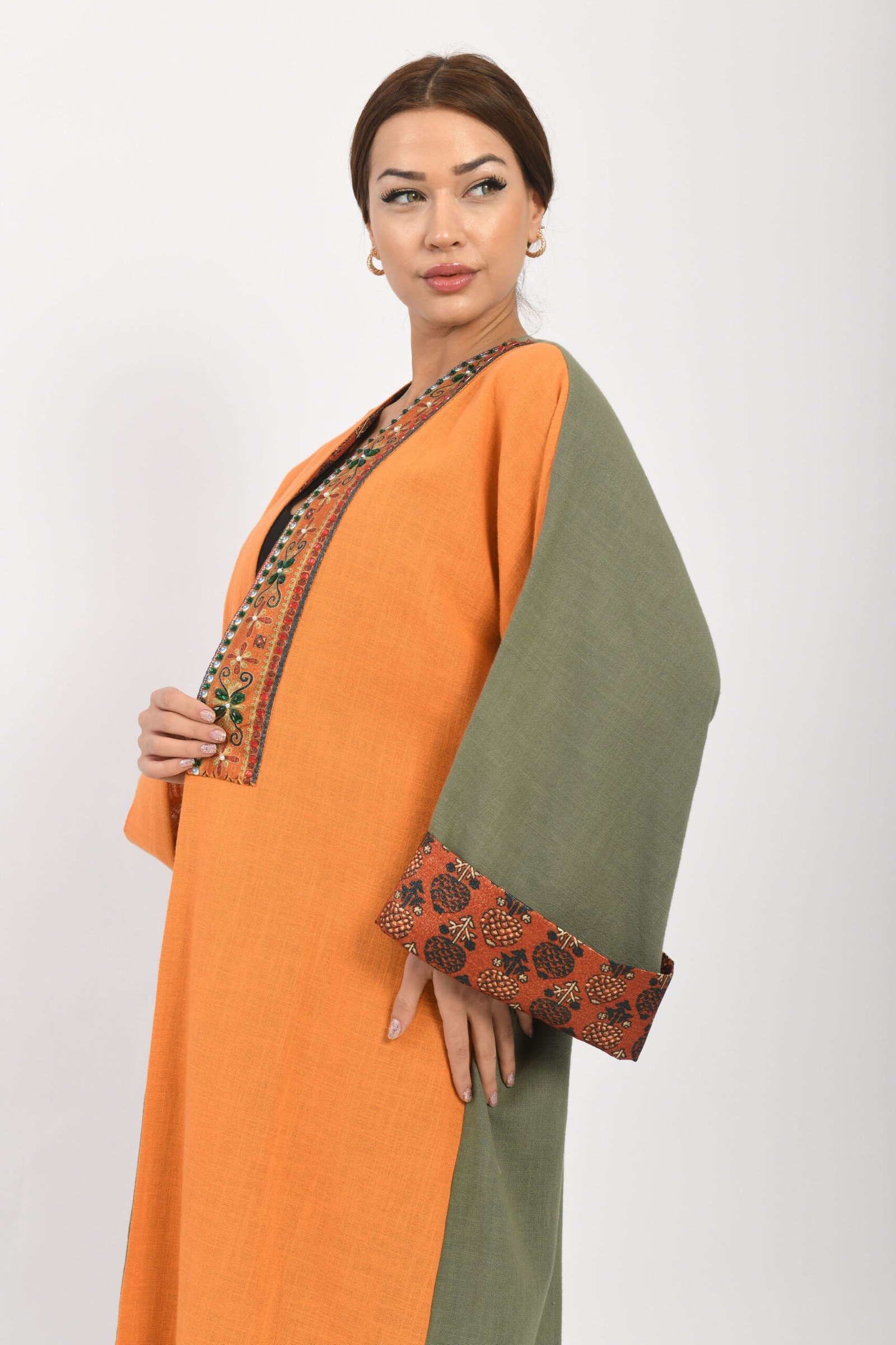 Bu abayanın en çarpıcı özelliği, canlı turuncu renginin cesur ve aynı zamanda sofistike duruşudur. Her anınızda göz kamaştıracak detaylara sahip olan abaya, yakadan aşağı uzanan sim kumaş üzeri, pırıltılı taşlarla bezeli aksesuarıyla lüks bir dokunuş sunar. Bu ışıltılı detay, her hareketinizde zarafetinizi vurgular.